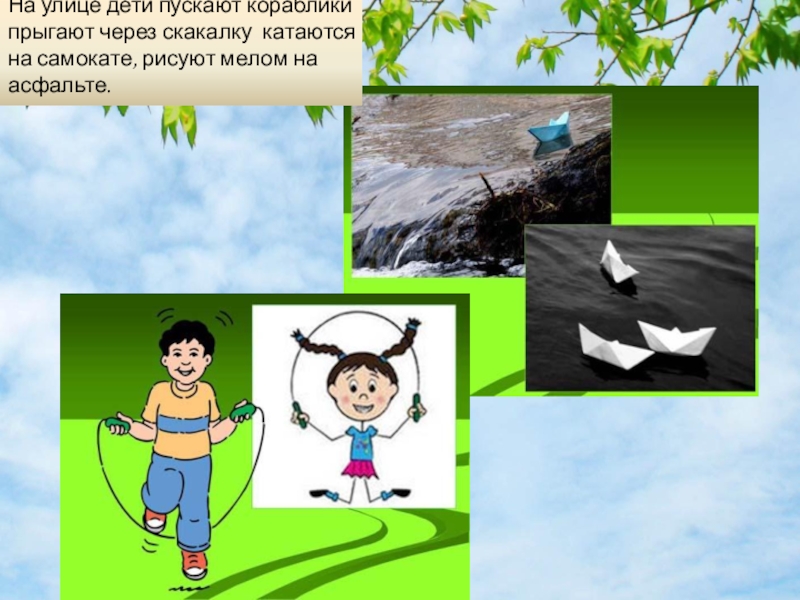Слайд 32На улице дети пускают кораблики прыгают через скакалку катаются на самокате,