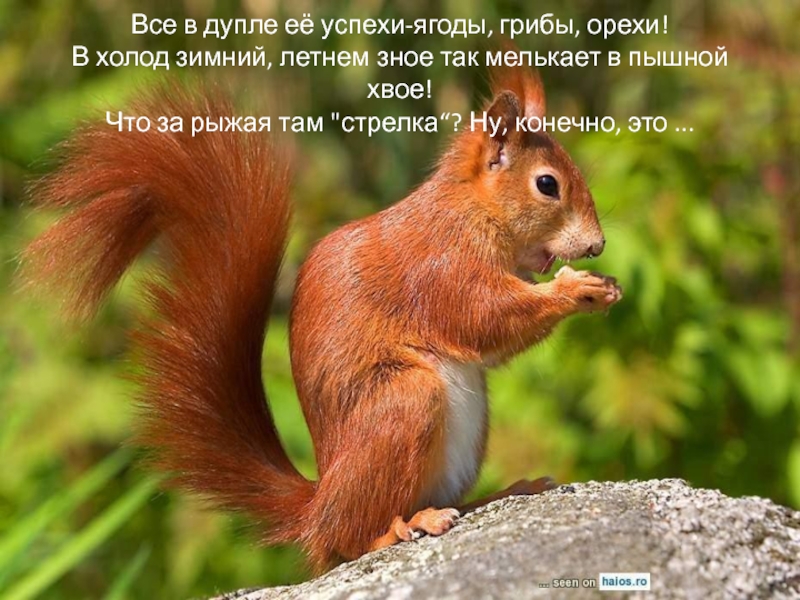 Все в дупле её успехи-ягоды, грибы, орехи! В холод зимний, летнем зное так мелькает в пышной хвое!