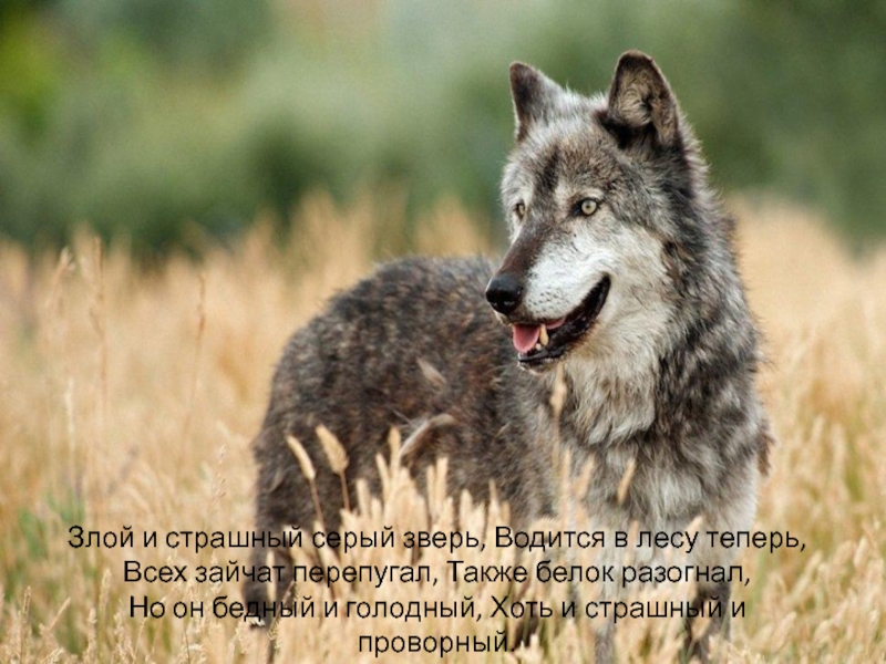 Слайд 6Злой и страшный серый зверь, Водится в лесу теперь, Всех зайчат перепугал,