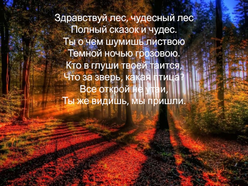 Здравствуй лес, чудесный лес  Полный сказок и чудес.  Ты о чем шумишь листвою  Темной