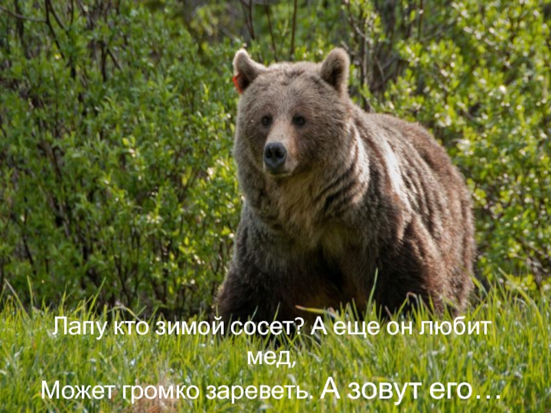 Слайд 4Лапу кто зимой сосет? А еще он любит мед, Может громко