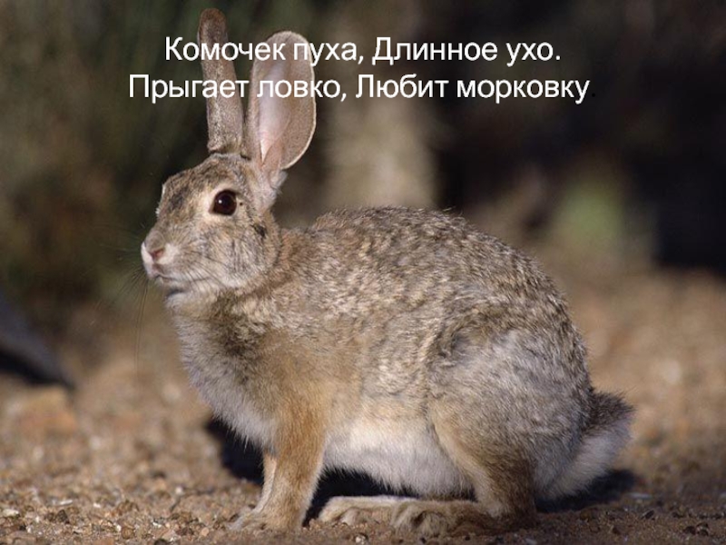 Слайд 7Комочек пуха, Длинное ухо. Прыгает ловко, Любит морковку.