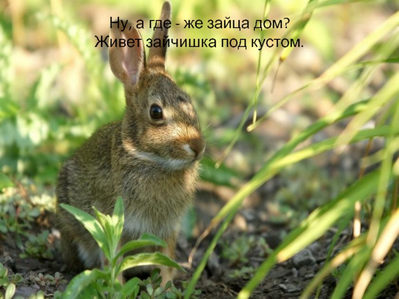 Слайд 11Ну, а где - же зайца дом? Живет зайчишка под кустом.