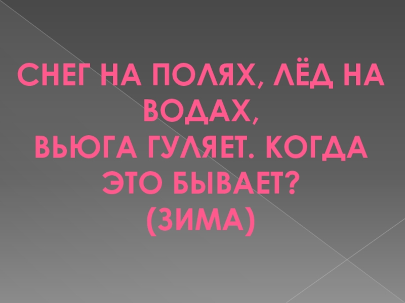 Слайд 1Снег на полях, лёд на водах, Вьюга гуляет. Когда это бывает? (Зима)