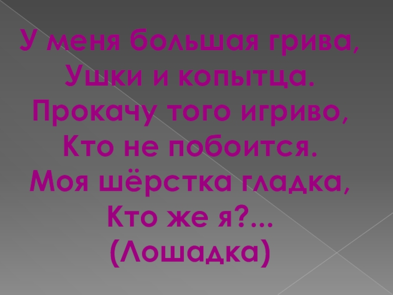 У меня большая грива, Ушки и копытца. Прокачу того игриво, Кто не побоится. Моя шёрстка гладка, Кто