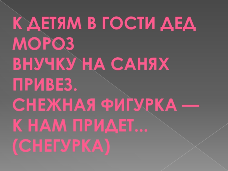 К детям в гости Дед МорозВнучку на санях привез.Снежная фигурка —К нам придет... (Снегурка)