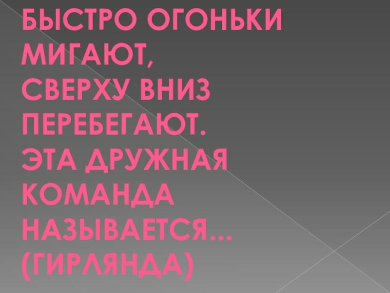 Быстро огоньки мигают,Сверху вниз перебегают.Эта дружная командаНазывается... (гирлянда)