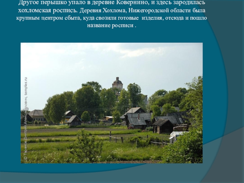 Слайд 8Другое перышко упало в деревне Ковернино, и здесь зародилась хохломская роспись.