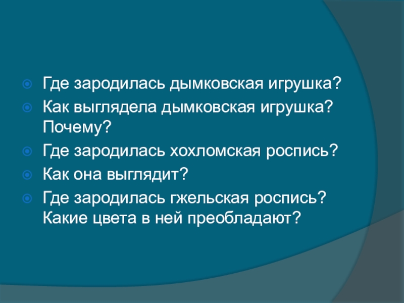 Где зародилась дымковская игрушка?Как выглядела дымковская игрушка? Почему?Где зародилась хохломская роспись?Как она выглядит?Где зародилась гжельская роспись? Какие