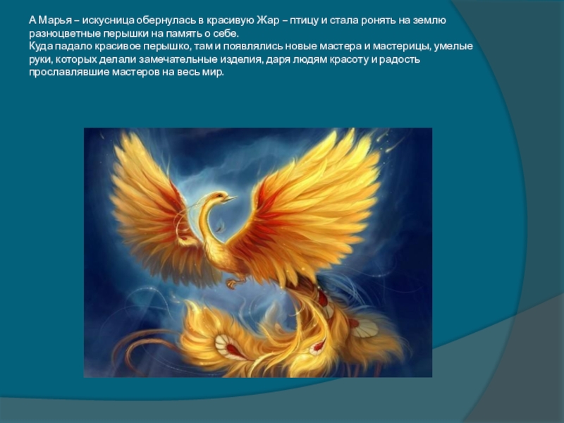 Слайд 5 А Марья – искусница обернулась в красивую Жар – птицу и