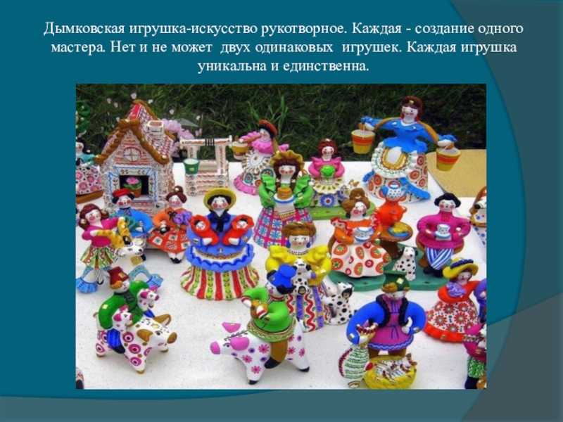 Слайд 7Дымковская игрушка-искусство рукотворное. Каждая - создание одного мастера. Нет и не