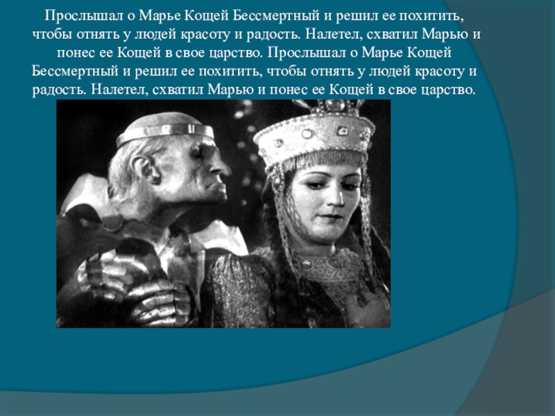 Слайд 4Прослышал о Марье Кощей Бессмертный и решил ее похитить, чтобы отнять