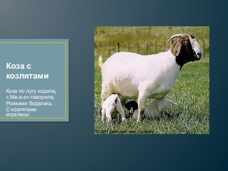 Коза с козлятамиКоза по лугу ходила,« Ме-е-е» говорила,Рожками бодаласьС козлятами игралась!