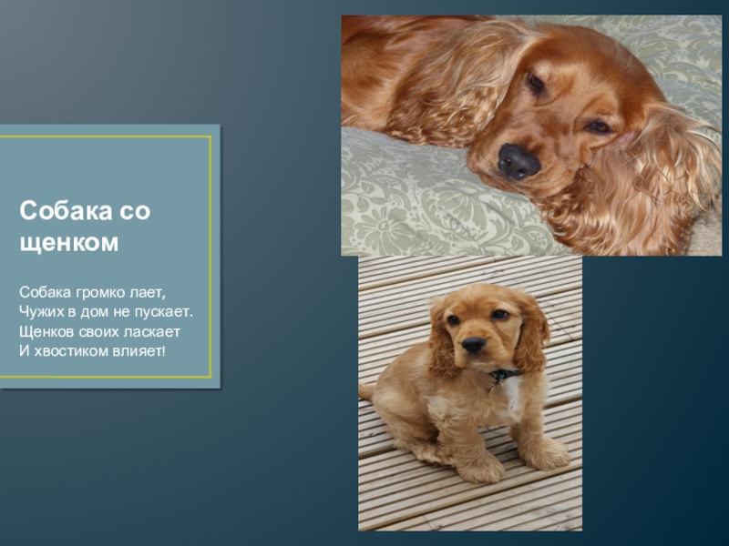 Собака со щенкомСобака громко лает,Чужих в дом не пускает.Щенков своих ласкаетИ хвостиком влияет!