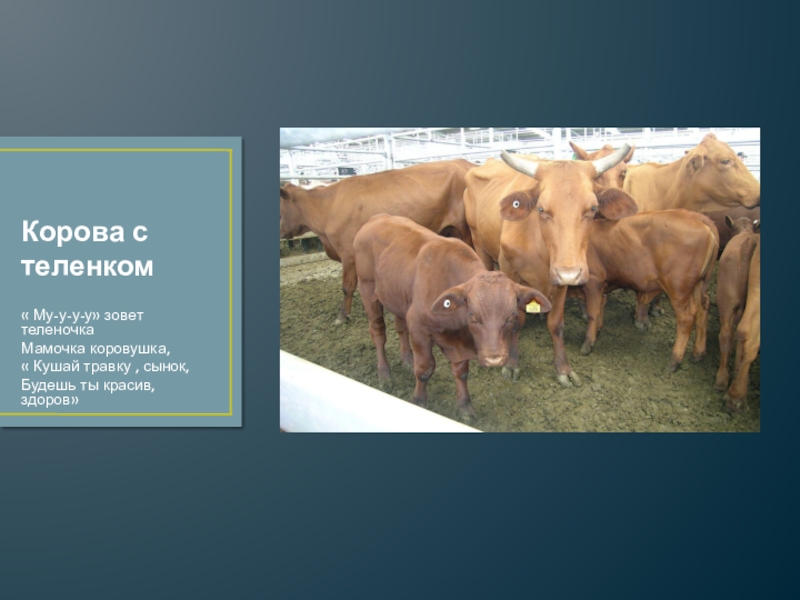 Корова с теленком« Му-у-у-у» зовет теленочкаМамочка коровушка,« Кушай травку , сынок,Будешь ты красив, здоров»