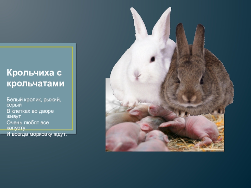 Крольчиха с крольчатамиБелый кролик, рыжий,серыйВ клетках во дворе живутОчень любят все капустуИ всегда морковку ждут.