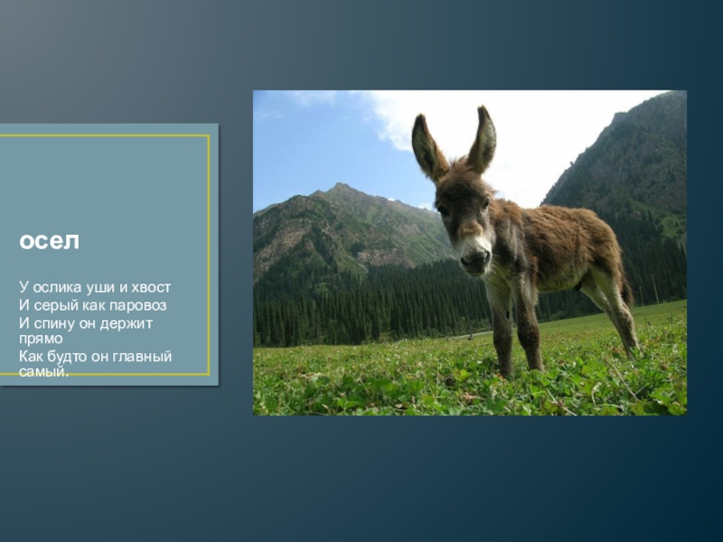 оселУ ослика уши и хвостИ серый как паровозИ спину он держит прямоКак будто он главный самый.