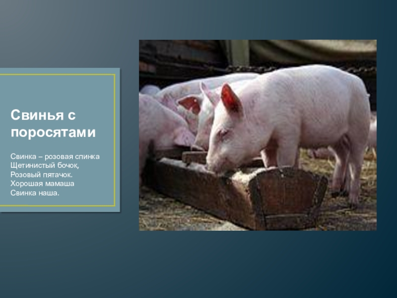 Свинья с поросятамиСвинка – розовая спинкаЩетинистый бочок,Розовый пятачок.Хорошая мамашаСвинка наша.