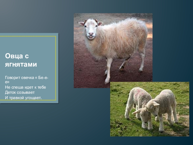 Овца с ягнятамиГоворит овечка « Бе-е-е»Не спеша идет к тебеДеток созываетИ травкой угощает.