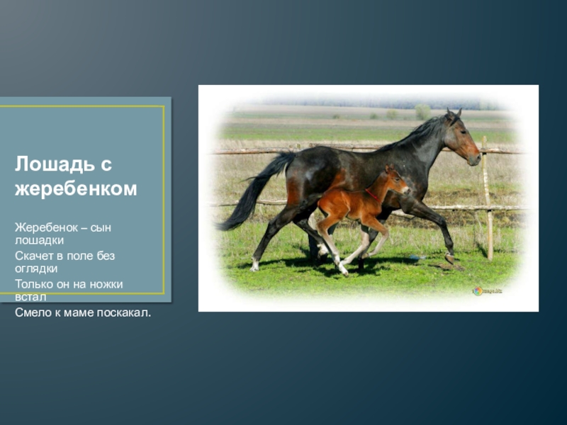 Лошадь с жеребенкомЖеребенок – сын лошадкиСкачет в поле без оглядкиТолько он на ножки всталСмело к маме поскакал.