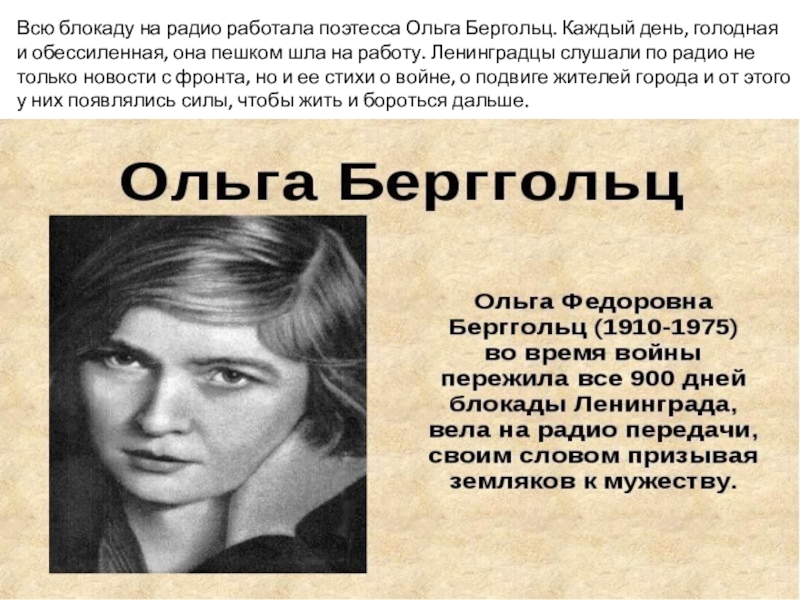 Слайд 21Всю блокаду на радио работала поэтесса Ольга Бергольц. Каждый день, голодная