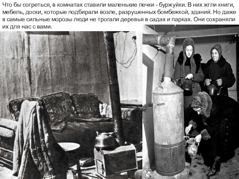Слайд 12Что бы согреться, в комнатах ставили маленькие печки - буржуйки. В