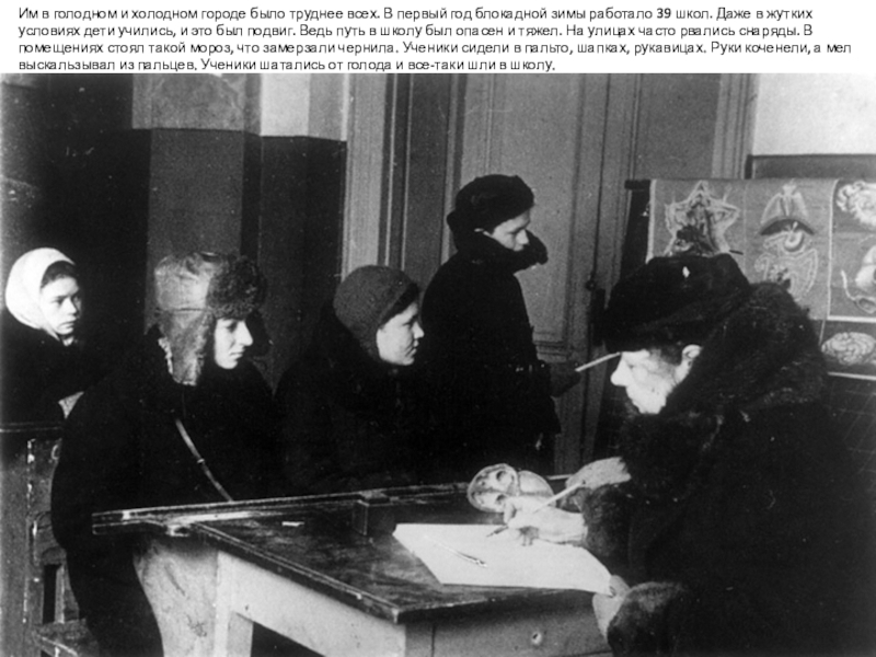 год блокадной зимы работало 39 школ. Даже в жутких условиях дети учились, и это был подвиг. Ведь путь в школу был опасен и тяжел. На улицах часто рвались снаряды. В помещениях стоял такой мороз, что замерзали чернила. Ученики сидели в пальто, шапках, рукавицах. Руки коченели, а мел выскальзывал из пальцев. Ученики шатались от голода и все-таки шли в школу.