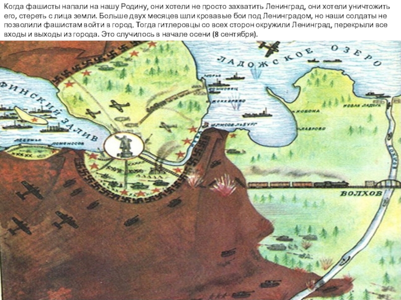 Ленинград, они хотели уничтожить его, стереть с лица земли. Больше двух месяцев шли кровавые бои под Ленинградом, но наши солдаты не позволили фашистам войти в город. Тогда гитлеровцы со всех сторон окружили Ленинград, перекрыли все входы и выходы из города. Это случилось в начале осени (8 сентября).