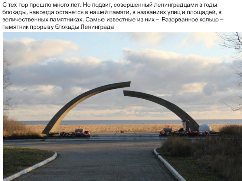 годы блокады, навсегда останется в нашей памяти, в названиях улиц и площадей, в величественных памятниках. Самые известные из них – Разорванное кольцо – памятник прорыву блокады Ленинграда