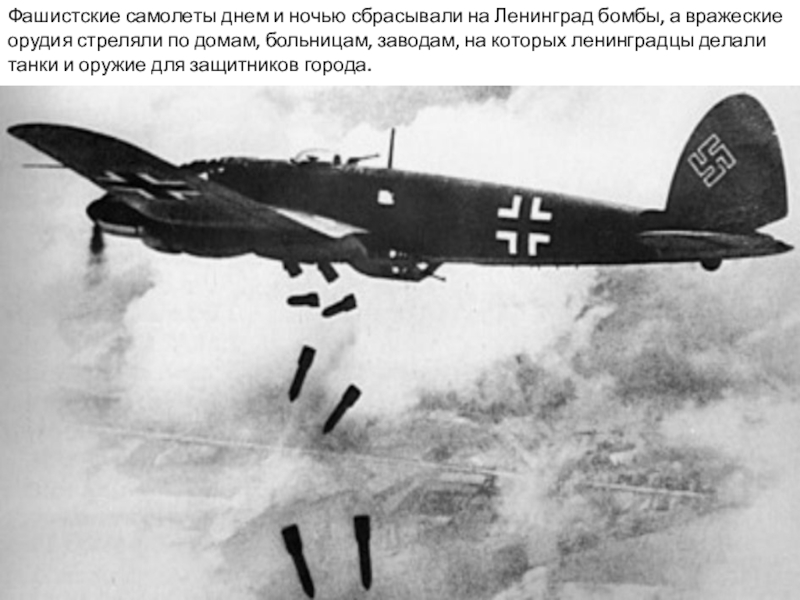 Слайд 15Фашистские самолеты днем и ночью сбрасывали на Ленинград бомбы, а вражеские