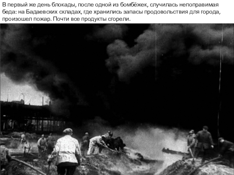 Слайд 5В первый же день блокады, после одной из бомбёжек, случилась непоправимая