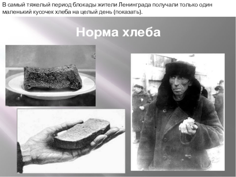 Слайд 6В самый тяжелый период блокады жители Ленинграда получали только один маленький