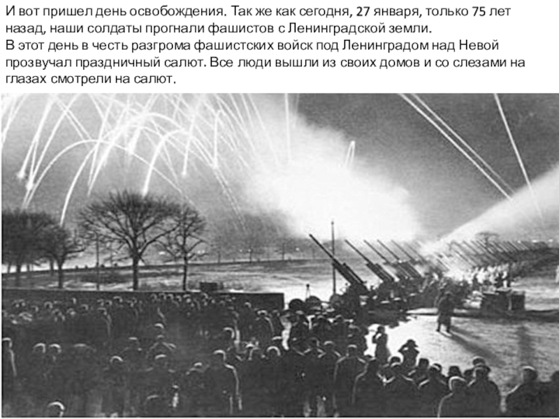 В этот день в честь разгрома фашистских войск под Ленинградом над Невой прозвучал праздничный салют. Все люди вышли из своих домов и со слезами на глазах смотрели на салют.