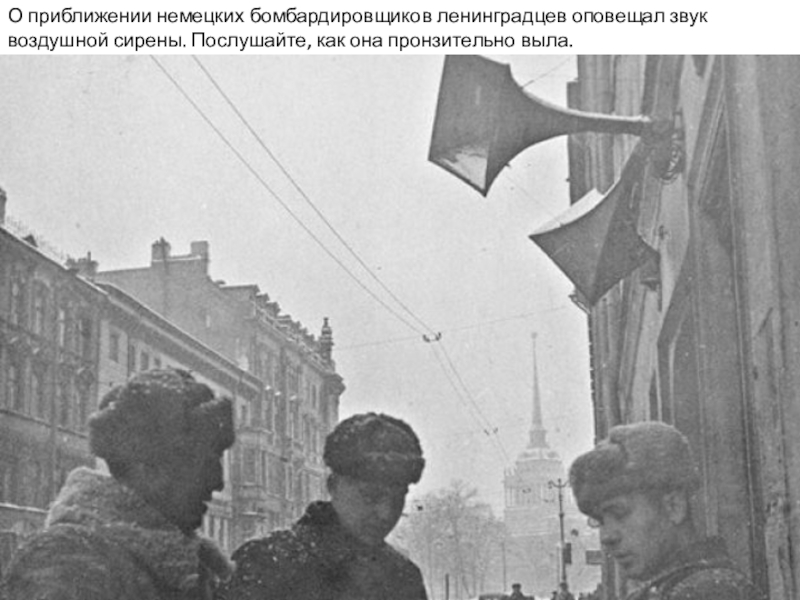 Слайд 17О приближении немецких бомбардировщиков ленинградцев оповещал звук воздушной сирены. Послушайте, как