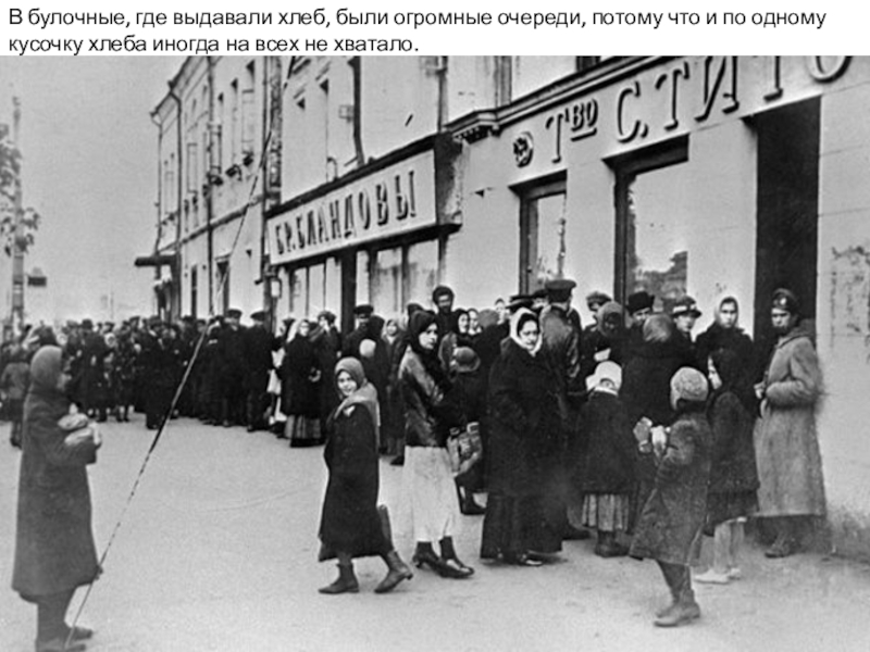 Слайд 7В булочные, где выдавали хлеб, были огромные очереди, потому что и