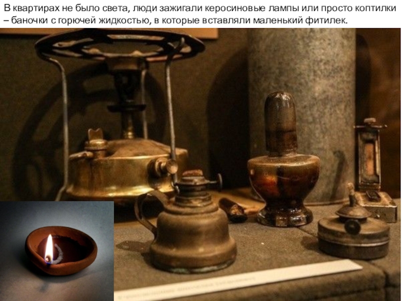 Слайд 13В квартирах не было света, люди зажигали керосиновые лампы или просто