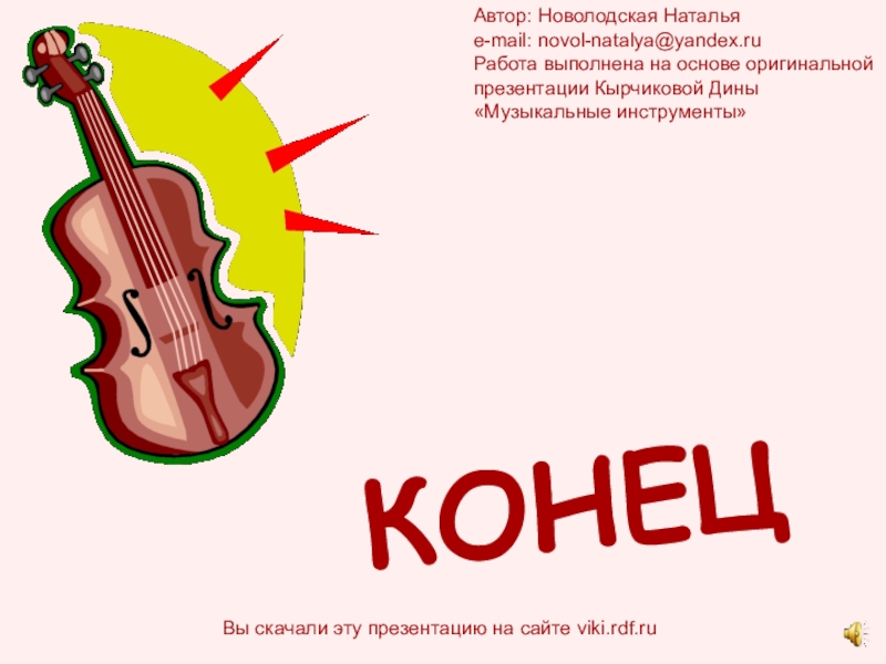 КОНЕЦВы скачали эту презентацию на сайте viki.rdf.ruАвтор: Новолодская Натальяe-mail: novol-natalya@yandex.ruРабота выполнена на основе оригинальнойпрезентации Кырчиковой Дины«Музыкальные инструменты»