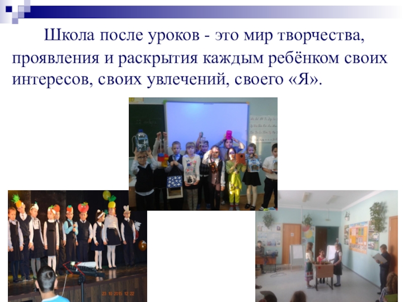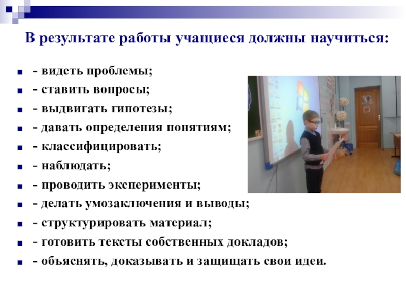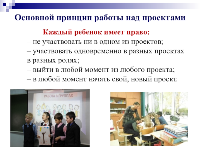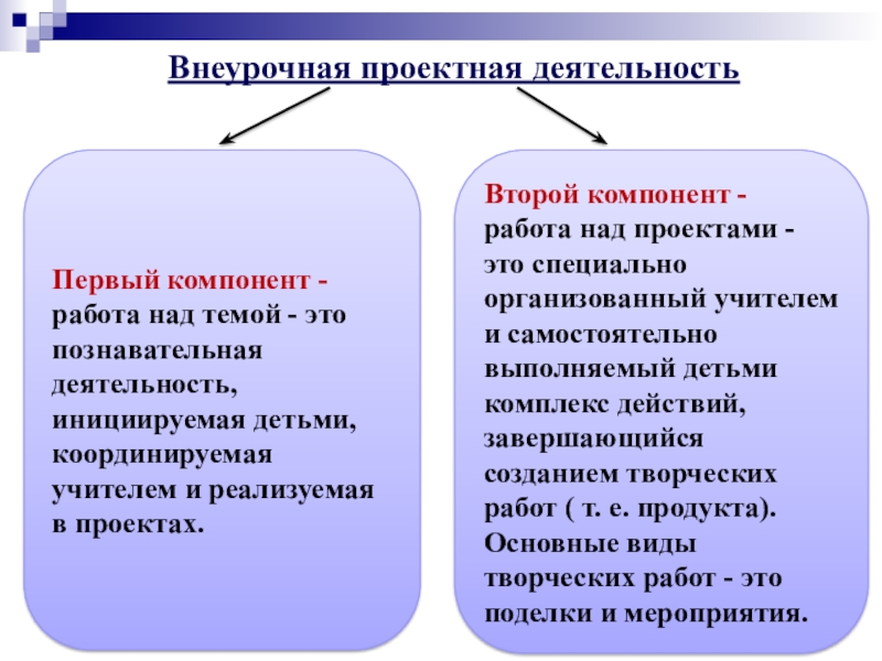 Второй компонент - работа над проектами - это специально организованный учителем и самостоятельно выполняемый детьми комплекс действий, завершающийся созданием творческих работ ( т. е. продукта). Основные виды творческих работ - это поделки и мероприятия.