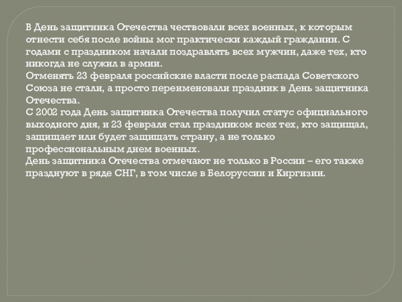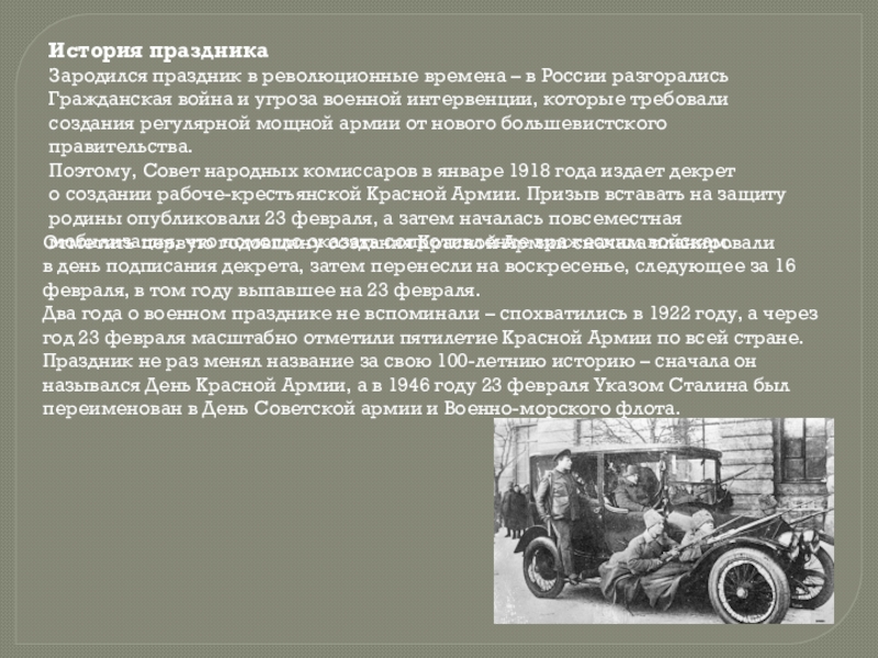 Праздник не раз менял название за свою 100-летнию историю – сначала он назывался День Красной Армии, а в 1946 году 23 февраля Указом Сталина был переименован в День Советской армии и Военно-морского флота.