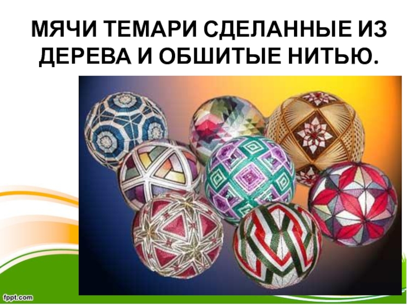 Слайд 14МЯЧИ ТЕМАРИ СДЕЛАННЫЕ ИЗ ДЕРЕВА И ОБШИТЫЕ НИТЬЮ.