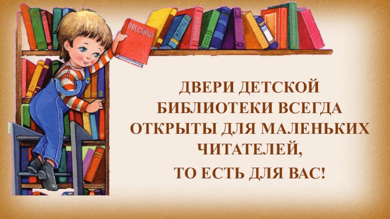 Слайд 9ДВЕРИ ДЕТСКОЙ БИБЛИОТЕКИ ВСЕГДА ОТКРЫТЫ ДЛЯ МАЛЕНЬКИХ ЧИТАТЕЛЕЙ,
