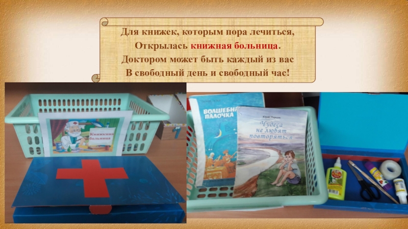 Для книжек, которым пора лечиться,Открылась книжная больница.Доктором может быть каждый из васВ свободный день и свободный час!