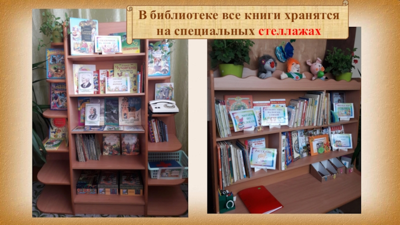 Слайд 3В библиотеке все книги хранятся на специальных стеллажах