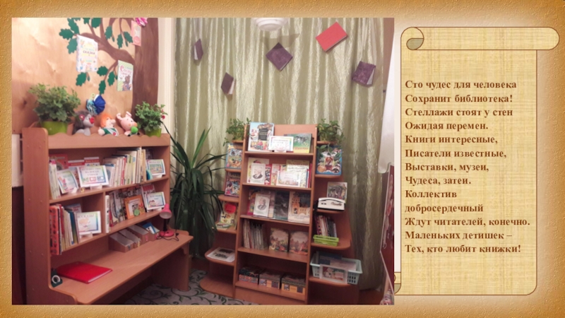 Сто чудес для человека Сохранит библиотека!  Стеллажи стоят у стен Ожидая перемен. Книги интересные, Писатели известные, Выставки, музеи, Чудеса, затеи. Коллектив добросердечный Ждут читателей, конечно. Маленьких детишек – Тех, кто любит книжки!