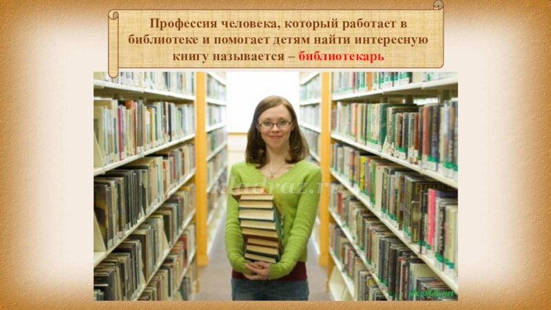Слайд 4Профессия человека, который работает в библиотеке и помогает детям найти интересную