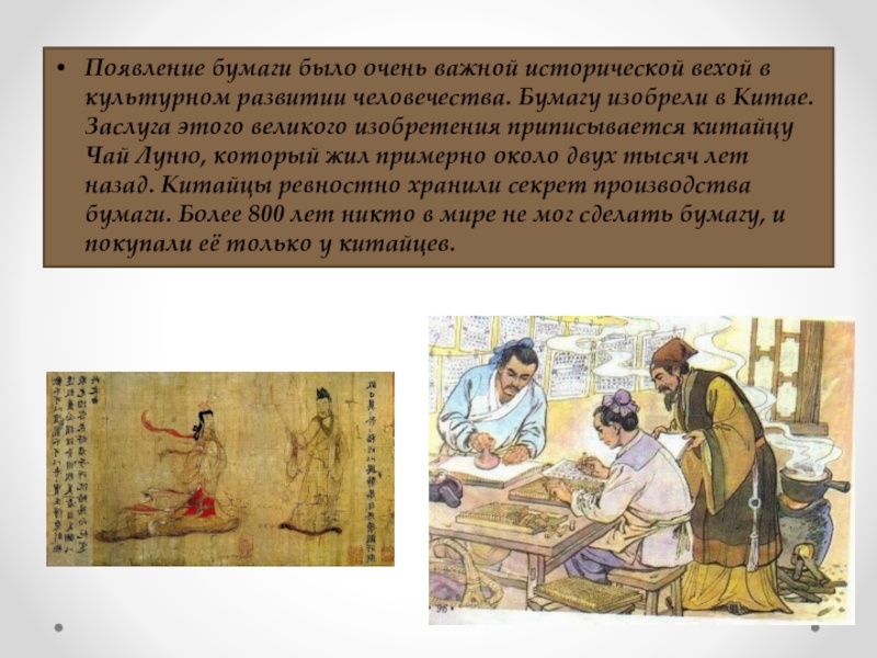 Слайд 8Появление бумаги было очень важной исторической вехой в культурном развитии человечества. Бумагу изобрели