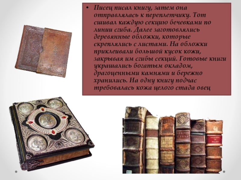 секцию бечевками по линии сгиба. Далее заготовлялись деревянные обложки, которые скреплялись с листами. На обложки приклеивали большой кусок кожи, закрывая им сгибы секций. Готовые книги украшались богатым окладом, драгоценными камнями и бережно хранились. На одну книгу подчас требовалась кожа целого стада овец