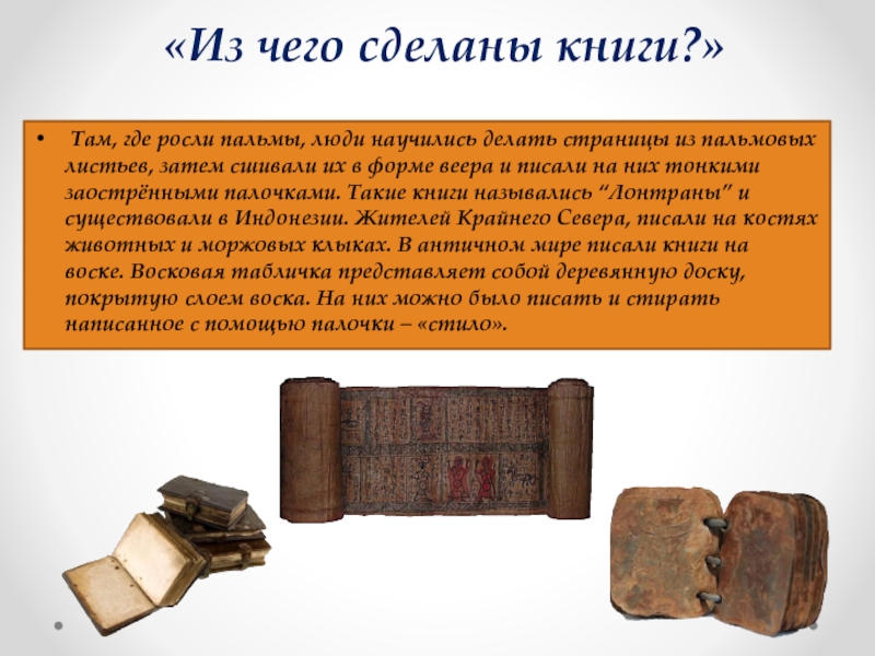 из пальмовых листьев, затем сшивали их в форме веера и писали на них тонкими заострёнными палочками. Такие книги назывались “Лонтраны” и существовали в Индонезии. Жителей Крайнего Севера, писали на костях животных и моржовых клыках. В античном мире писали книги на воске. Восковая табличка представляет собой деревянную доску, покрытую слоем воска. На них можно было писать и стирать написанное с помощью палочки – «стило».