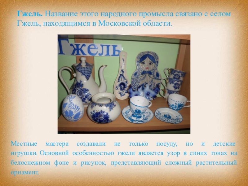 Местные мастера создавали не только посуду, но и детские игрушки. Основной особенностью гжели является узор в синих тонах на белоснежном фоне и рисунок, представляющий сложный растительный орнамент.