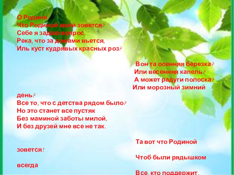 О Родине Что Родиной моей зовется?  Себе я задаю вопрос.  Река, что за домами вьется,  Иль куст кудрявых красных роз?
